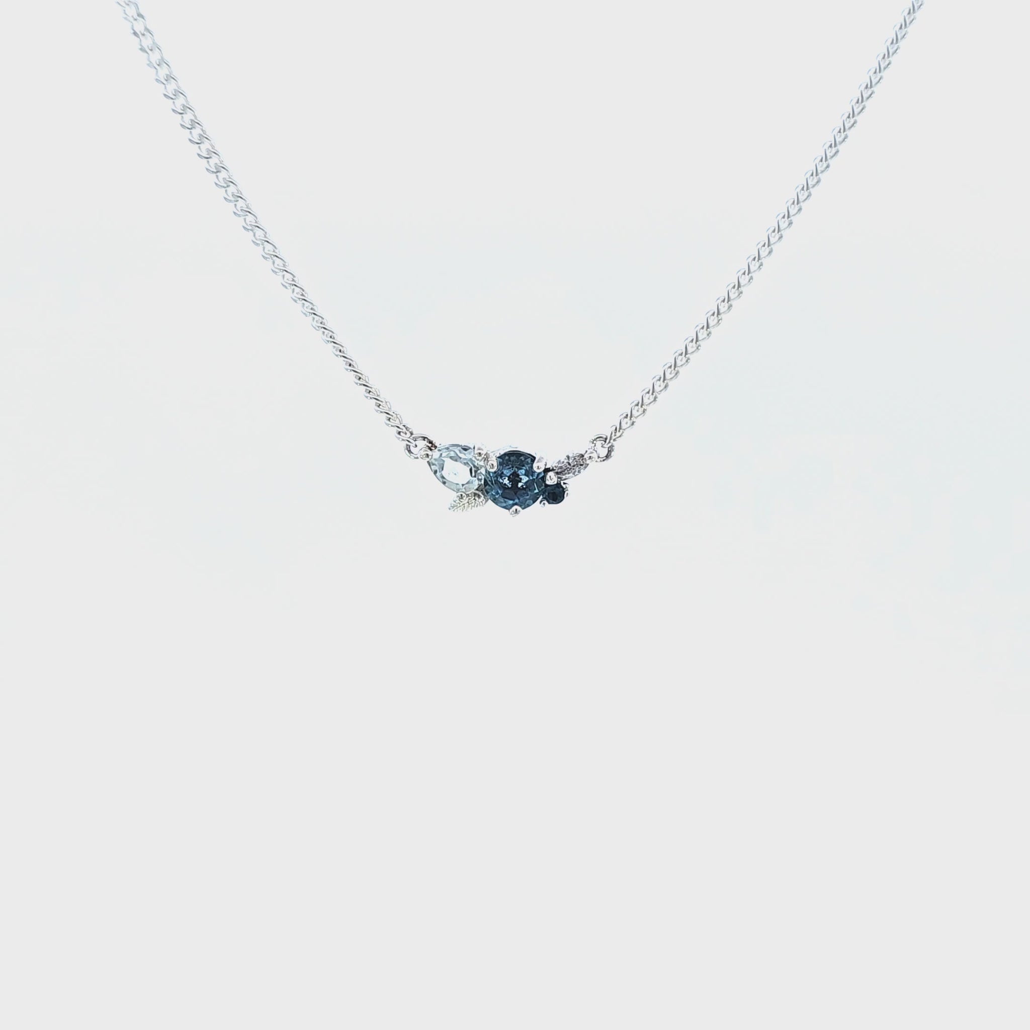 Like sunlight catching spray at the base of a waterfall, this delicate cluster shimmers in shifting blues. Three topaz stones in different shades of blue flow together like moving water—bright, clear, and deep—while a single lab-grown diamond flashes like a crisp drop of light in the mist. Finished with a tiny silver leaf, it’s a quiet little reminder to follow the current and keep chasing wonder.